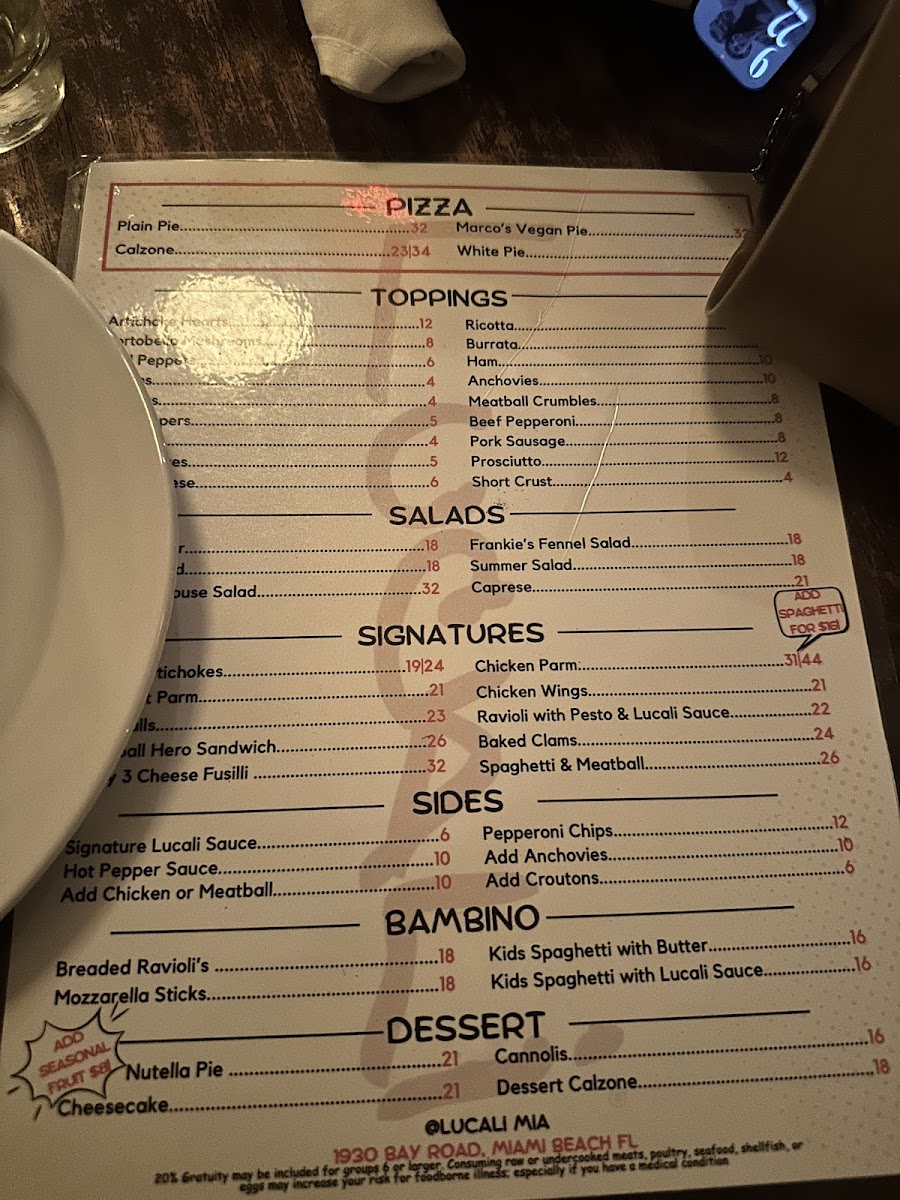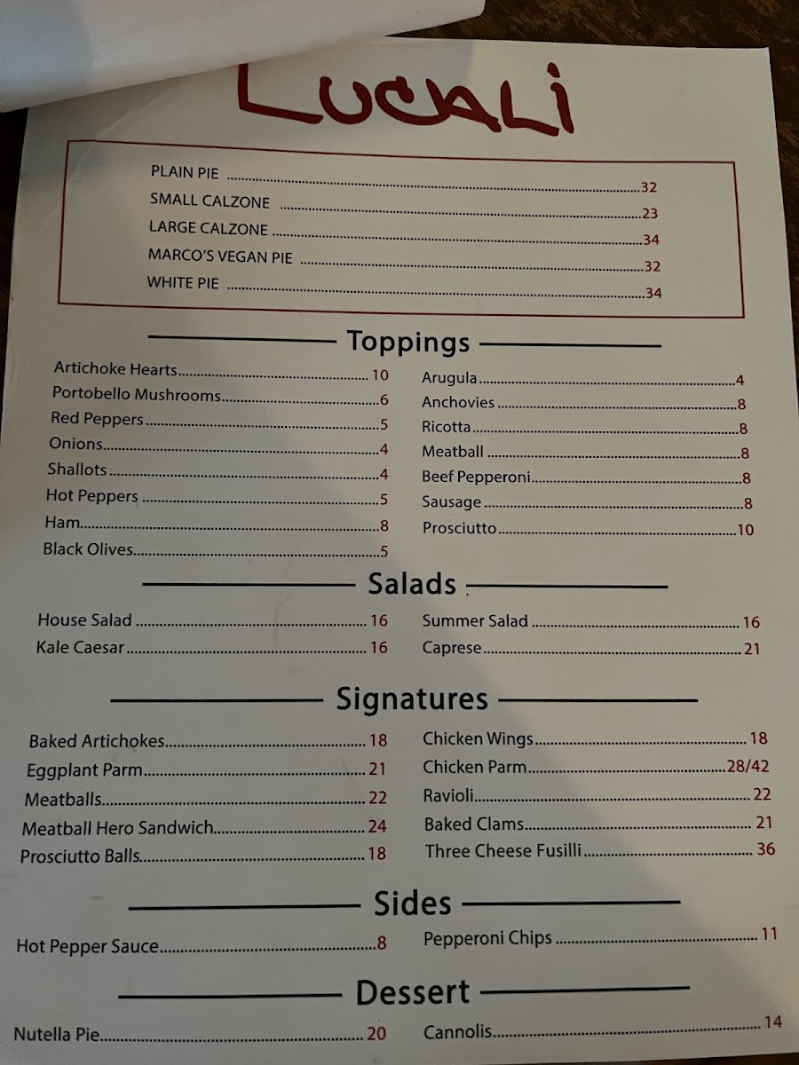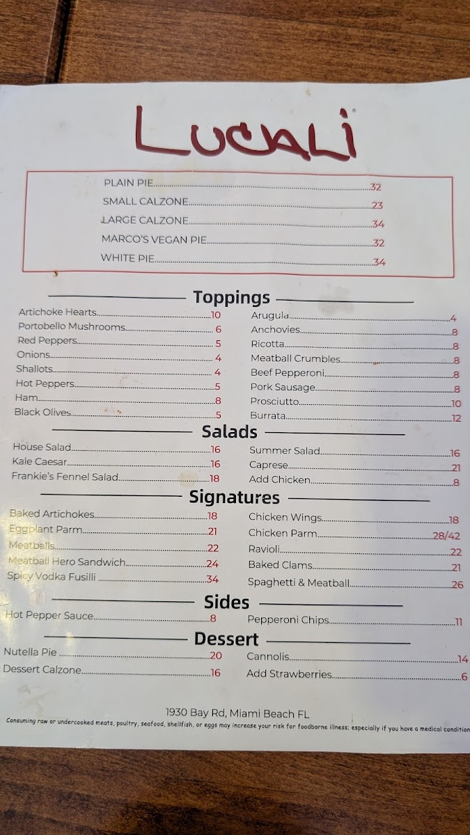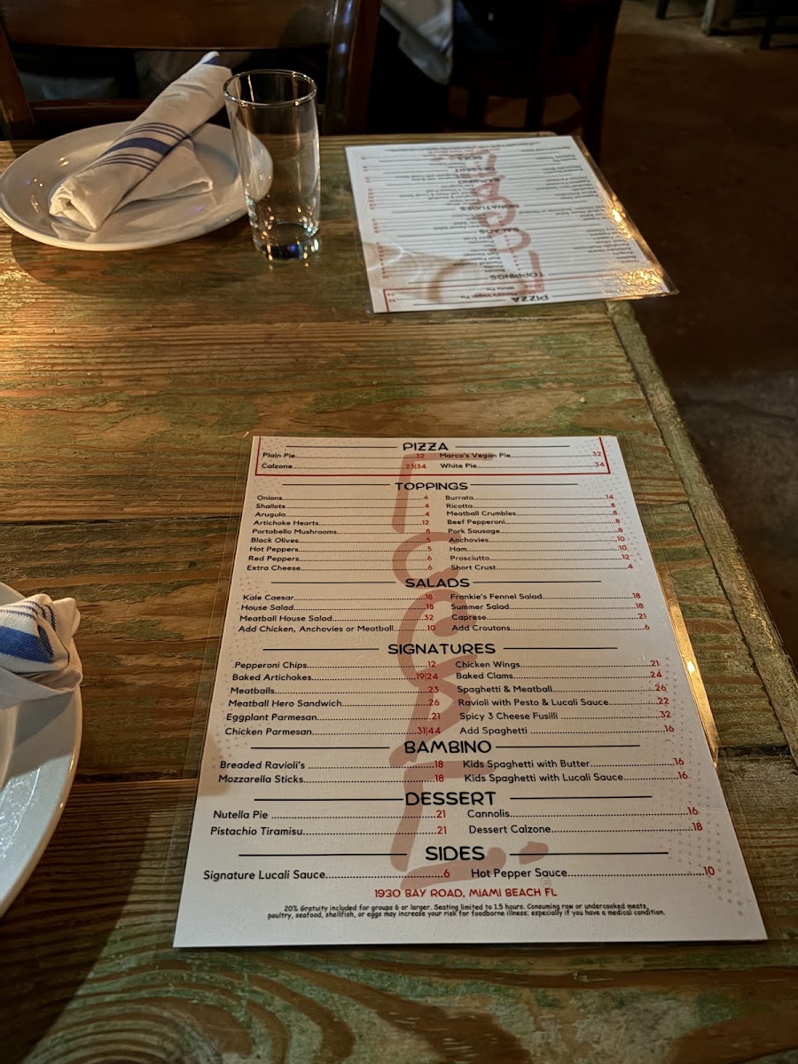 Located in the heart of Miami Beach, Lucali Menu offers a delightful culinary experience perfect for pizza lovers. As you browse through the menu, you'll discover a variety of handmade, wood-fired pizzas, each crafted with the finest ingredients. Whether you prefer a classic Margherita or something more adventurous, there's a pizza to suit every taste. But it doesn’t stop at pizza-Lucali also features a range of delicious appetizers, fresh salads, and mouthwatering desserts, ensuring that every meal is balanced and satisfying. The inviting atmosphere of the restaurant makes it an ideal spot for casual dinners with friends or family, where every bite feels like a celebration of great food. With a focus on quality and flavor, Lucali Menu guarantees an unforgettable dining experience right in the heart of vibrant Miami Beach.
